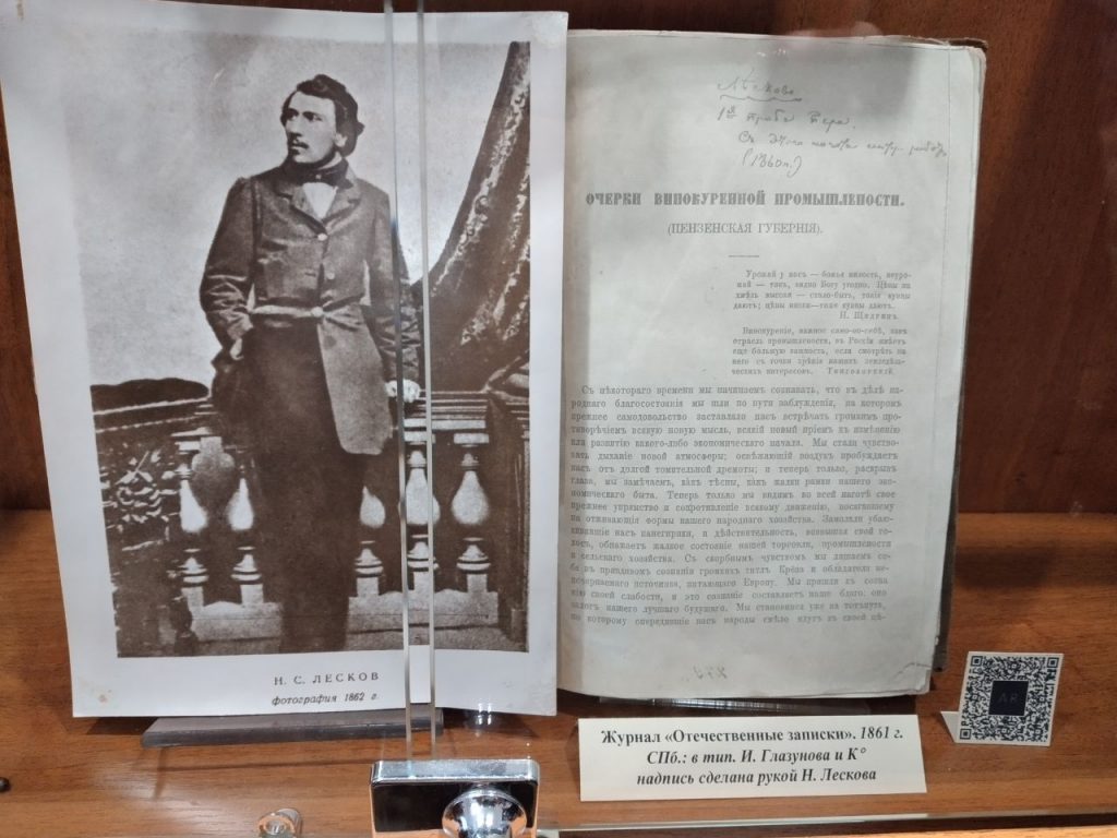 На фото 1. Лесков Н.С.»Очерки винокуренной промышленности» (Пензенская губерния) — экспонат Литературного музея.
